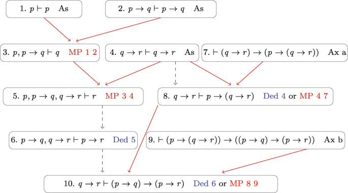 In the i-th line, Ni is the order number of the proposition Fi in the argument sequence. Ri is an expression in the following form that shows that Fi applies to one of clauses 1 or 2 in the above definition, in such a way that if Fi is the main subject, Ri is the name of that main subject, i.e. A1 or A2, and if for Fi the propositions Aj and Ak existed as in paragraph 2 of the definition, Ri is equal to j,k, where j and k are the numbers of the jth and kth lines in the proof sequence. Fn is the input statement.